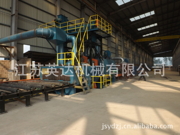 板材預(yù)處理線 型材預(yù)處理線為連續(xù)送料的高功能連續(xù)作業(yè)清理,在清理過程中由電氣控制的變頻電機(jī)驅(qū)動輥道將工件送進(jìn)清理機(jī)室體內(nèi)拋射區(qū)時,其周身各面受到來自不同坐標(biāo)方位的強(qiáng)力密集彈丸的打擊與磨擦,使工件上的氧化皮及其污物迅速脫落,工件表面獲得粗糙度的光潔表面。落入工件上面的彈丸與銹塵經(jīng)回收螺旋輸送到彈丸循環(huán)系統(tǒng),由清理室外兩邊裝卸工件。清理過程中,撒落下來的丸塵混合物經(jīng)室體漏斗、縱橫向螺旋輸送機(jī)匯集于提升機(jī)下部,再提升到機(jī)器上部的分離器里,分離后的純凈彈丸落入分離器料斗中,供拋丸循環(huán)使用。拋丸清理過程中產(chǎn)生的塵埃由抽風(fēng)管送向除塵系統(tǒng),凈化處理后的凈氣排放到大氣中,顆粒狀塵埃被捕捉收集。