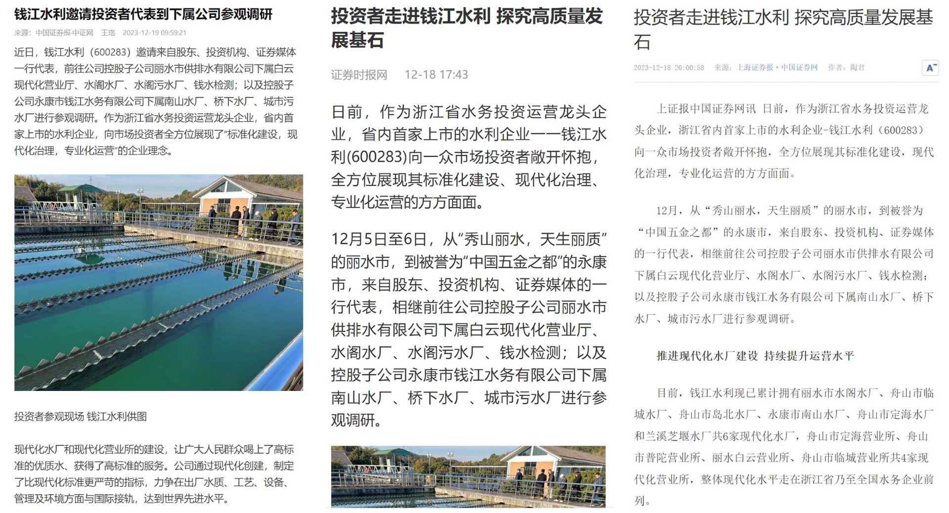 近日,中國水務所屬上市公司錢江水利向一眾市場投資者敞開懷抱,全方位展現(xiàn)上市公司“標準化建設,現(xiàn)代化治理,專業(yè)化運營”的企業(yè)理念,為投資者呈現(xiàn)真實、透明的上市公司,搭建傳遞、發(fā)現(xiàn)價值橋梁一事,中國證券報·中證網(wǎng)、證券時報、上海證券報等多家媒體采訪報道。