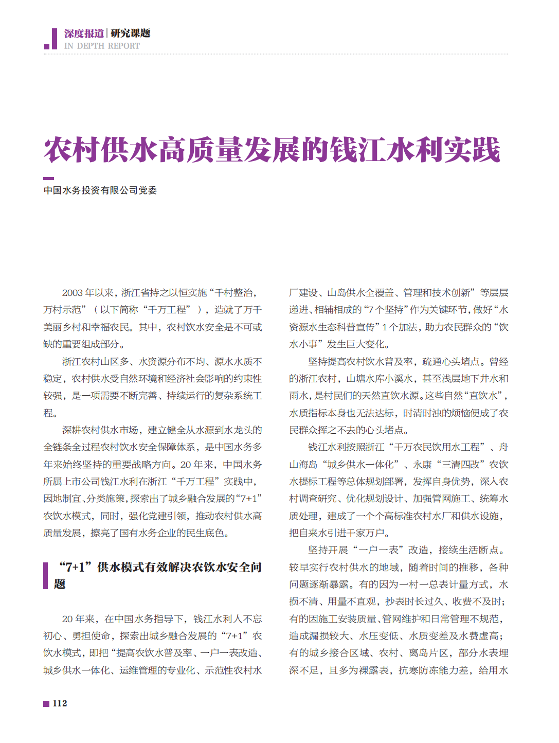 近日,由國務院國資委主管,國資委新聞中心和中國經(jīng)濟出版社聯(lián)合主辦《國資報告》雜志刊發(fā)中國水務文章——《農(nóng)村供水高質(zhì)量發(fā)展的錢江水利實踐》。中國水務在浙江“千萬工程”實踐中,因地制宜、分類施策,探索出了城鄉(xiāng)融合發(fā)展的“7+1”農(nóng)飲水模式,同時,強化黨建引領,推動農(nóng)村供水高質(zhì)量發(fā)展,擦亮了國有水務企業(yè)的民生底色。