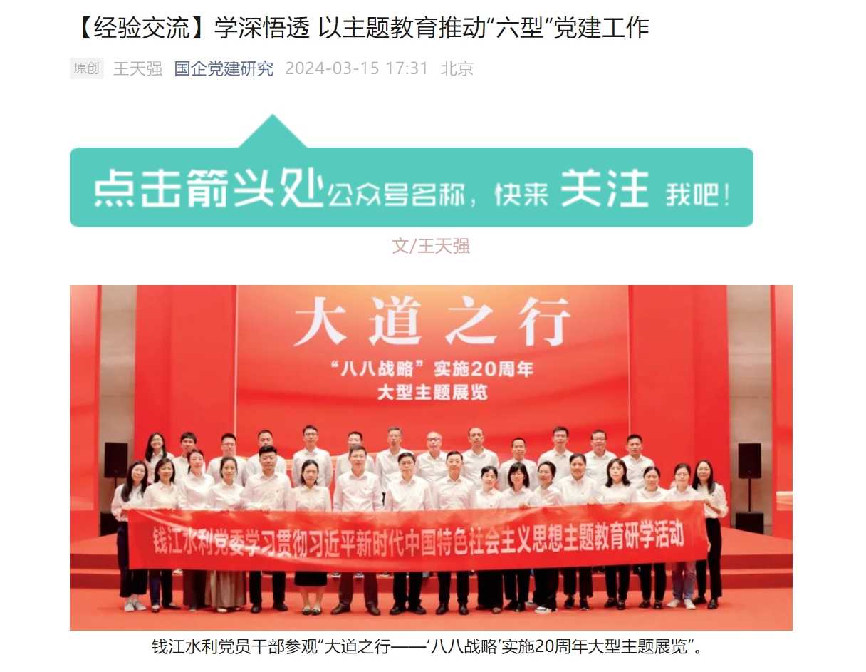 近日,《國企》雜志刊發(fā)中國水務(wù)下屬錢江水利第二批主題教育經(jīng)驗做法——《學(xué)深悟透 以主題教育推動“六型”黨建工作》。