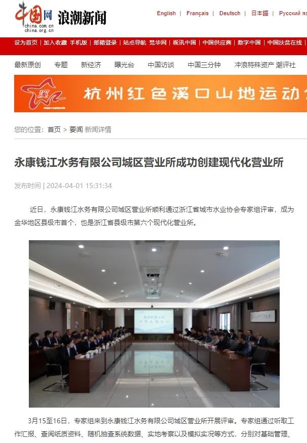 近日,新華社、中國網、中國新聞網等媒體報道中國水務所屬錢江水利永康錢江水務獲評“浙江省現代化營業(yè)所”,永康錢江水務城區(qū)營業(yè)所成為浙江省金華市首個縣級現代化營業(yè)所,標志著公司在所屬地區(qū)標準化生產及管理水平邁上新臺階。