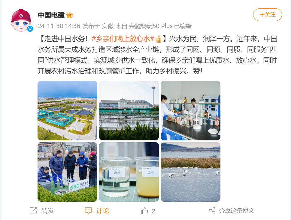 近日,紫光閣、國資小新、中國電建微博相繼點(diǎn)贊中國水務(wù)所屬榮成水務(wù)打造區(qū)域涉水全產(chǎn)業(yè)鏈,聚焦供水與排水(治污)兩大主業(yè),推動(dòng)城鄉(xiāng)供水一體化的高標(biāo)準(zhǔn)建設(shè)、高安全運(yùn)營、高質(zhì)量發(fā)展。此次微博發(fā)布累計(jì)粉絲傳播到達(dá)1800萬+,營造了中國水務(wù)擦亮“水名片”、做好“水文章”、講好水務(wù)故事的良好氛圍,展示了公司高質(zhì)量發(fā)展的“綠色答卷”。