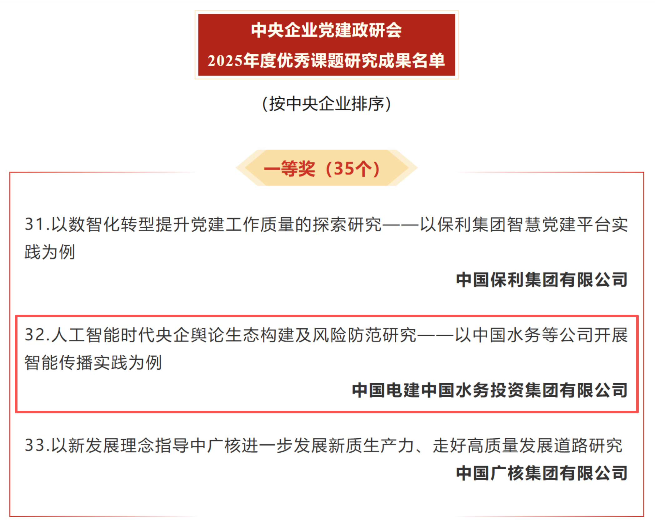 近日,中央企業(yè)黨建思想政治工作研究會(huì)2025年度優(yōu)秀課題研究成果名單公布。中國(guó)水務(wù)報(bào)送的《人工智能時(shí)代央企輿論生態(tài)構(gòu)建及風(fēng)險(xiǎn)防范研究--以中國(guó)水務(wù)等公司開(kāi)展智能傳播實(shí)踐為例》課題,榮獲一等獎(jiǎng)。此項(xiàng)榮譽(yù)的取得,充分展現(xiàn)了中國(guó)水務(wù)在黨建宣傳思想文化工作領(lǐng)域的研究與實(shí)踐成效,為中國(guó)水務(wù)思想政治工作創(chuàng)新提供了有益參考。