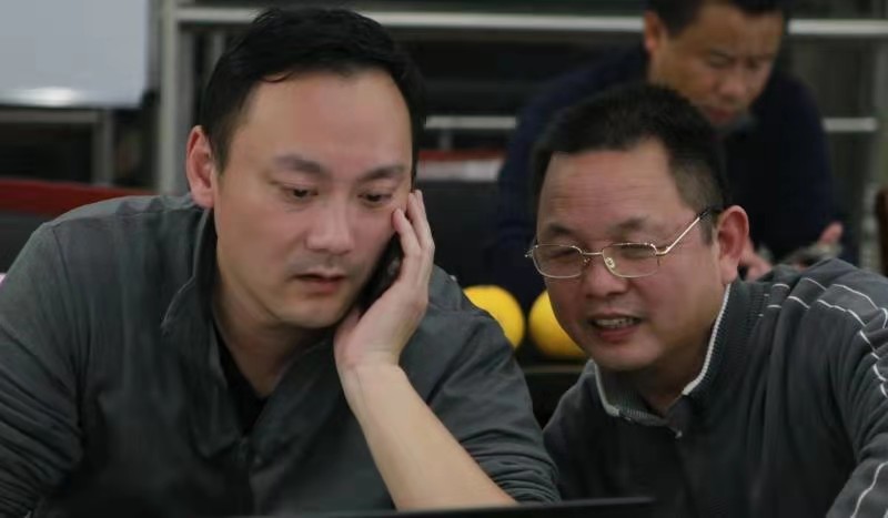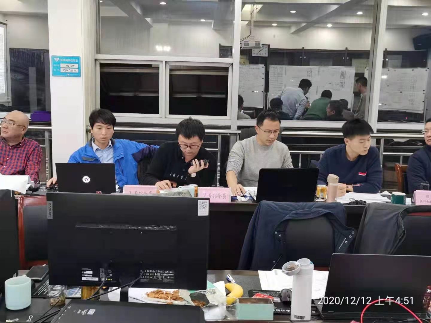 認(rèn)真商討工作細(xì)節(jié)的徐劍煒、王舒挺,累得睡倒在工位上的王舒挺