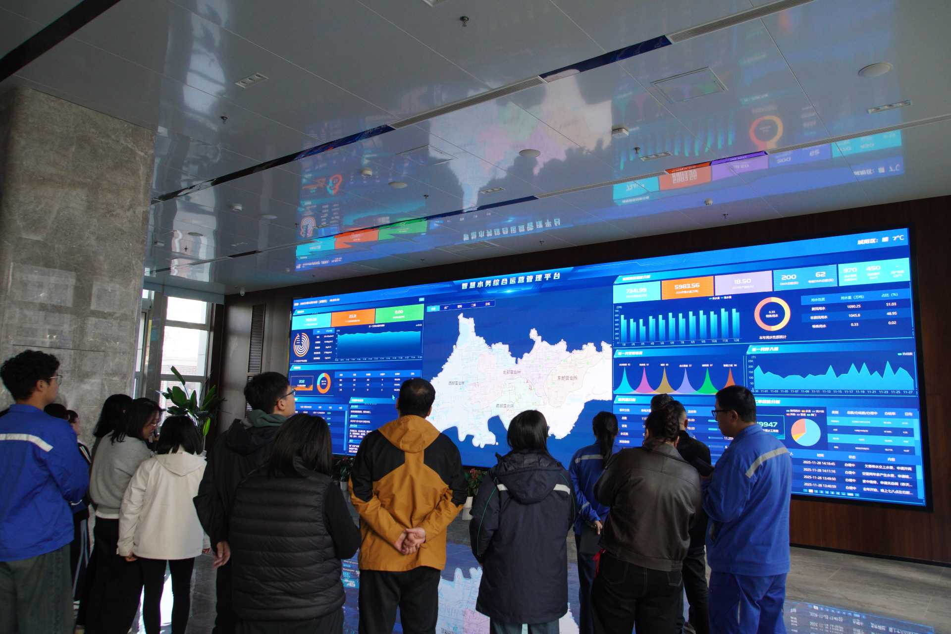 緊接著,觀摩團(tuán)來(lái)到智慧水務(wù)展示區(qū),工作人員通過(guò)實(shí)時(shí)操作,系統(tǒng)展示了從水源監(jiān)測(cè)、管網(wǎng)智能調(diào)度到用戶服務(wù)的全流程數(shù)字化管理平臺(tái)。該平臺(tái)以科技賦能水務(wù)管理,實(shí)現(xiàn)了運(yùn)行更智能、響應(yīng)更迅速、管理更精細(xì)的目標(biāo),集中展現(xiàn)了城陽(yáng)水務(wù)在水務(wù)現(xiàn)代化轉(zhuǎn)型、服務(wù)效能提升等方面的創(chuàng)新探索與實(shí)踐成果。