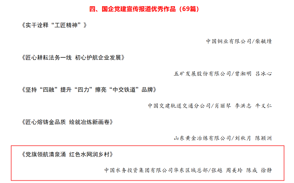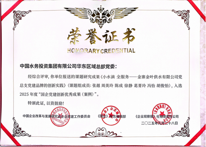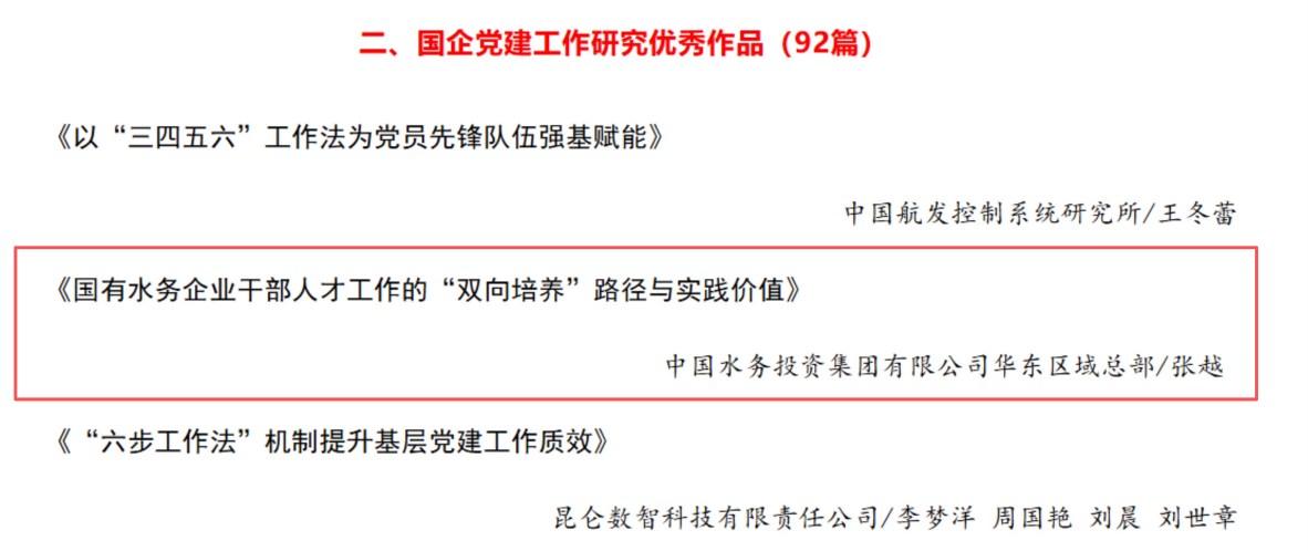 近日,《國企》雜志編輯部公布2025年度“國企黨建工作研究優(yōu)秀作品”,華東區(qū)域總部黨委書記、董事長、總經(jīng)理張越撰寫的《國有水務企業(yè)干部人才工作的“雙向培養(yǎng)”路徑與實踐價值》課題獲評國企黨建工作研究優(yōu)秀作品;《黨旗領航清泉涌紅色水網(wǎng)潤鄉(xiāng)村》獲評“國企黨建宣傳報道優(yōu)秀作品”;《“小水滴 全服務”——金寨金葉供水有限公司黨總支黨建品牌的創(chuàng)新實踐》獲評第六屆國企黨建創(chuàng)新優(yōu)秀成果,充分展現(xiàn)了區(qū)域總部在深化黨建理論研究、推動黨建工作實踐創(chuàng)新方面的顯著成效。
